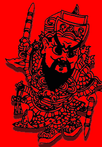 门神,传说是能捉鬼的神茶郁垒。东汉应劭的《风俗通》 中引《黄帝书》说:上古的时候,有神萘郁垒俩兄弟,他们住在度朔山上。山上有一棵桃树,树荫如盖。每天早上,他们便在这树下检阅百鬼。如果有恶鬼为害人间,便将其绑了喂老虎。 后来,人们便用两块桃木板画上神茶、郁垒的画像,挂在门的两边